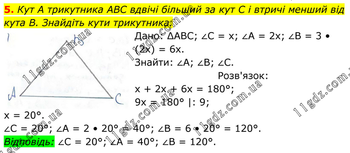 Кут А трикутника ABC вдвічі більший за кут C і втричі менший від кута В. Знайдіть кути трикутника. Дано: ∆АВС; ∠С = x; ∠A = 2x; ∠B = 3 • (2x) = 6x. Знайти: ∠A; ∠B; ∠C. Розв'язок: x + 2x + 6x = 180°; 9x = 180° |: 9; x = 20°. ∠С = 20°; ∠А = 2 • 20° = 40°; ∠В = 6 • 20° = 120°. Відповідь: ∠С = 20°; ∠A = 40°; ∠B = 120°.