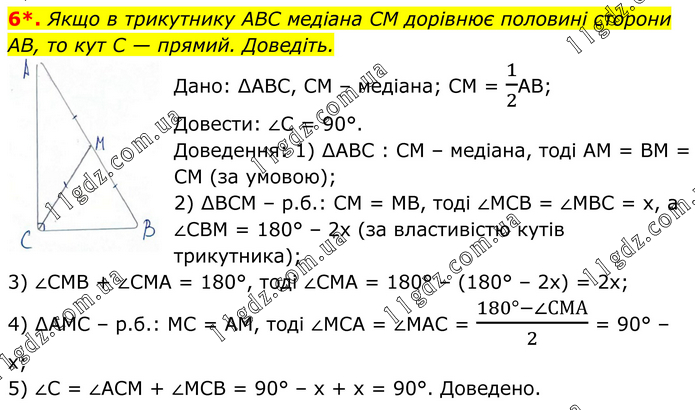 Якщо в трикутнику ABC медіана CM дорівнює половині сторони AB, то кут C — прямий. Доведіть. Дано: ∆АВС, СМ – медіана; СМ = 1/2АВ; Довести: ∠С = 90°. Доведення: 1) ∆АВС : СМ – медіана, тоді АМ = ВМ = СМ (за умовою); 2) ∆ВСМ – р.б.: СМ = МВ, тоді ∠МСВ = ∠МВС = x, a ∠CBM = 180° – 2x (за властивістю кутів трикутника); 3) ∠СМВ + ∠СМА = 180°, тоді ∠СМА = 180° – (180° – 2x) = 2x; 4) ∆AMC – р.б.: МС = АМ, тоді ∠МСА = ∠МАС = (180°-∠СМА)/2 = 90° – x; 5) ∠C = ∠ACM + ∠MCB = 90° – x + x = 90°. Доведено.