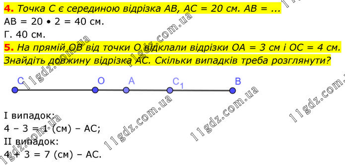 4. Точка C є серединою відрізка AB, AC = 20 см. AB = ... AB = 20 • 2 = 40 см. Г. 40 см. 5. На прямій OB від точки O відклали відрізки OA = 3 см і OC = 4 см. Знайдіть довжину відрізка AC. Скільки випадків треба розглянути? І випадок: 4 – 3 = 1 (см) – АС; ІІ випадок: 4 + 3 = 7 (см) – АС.