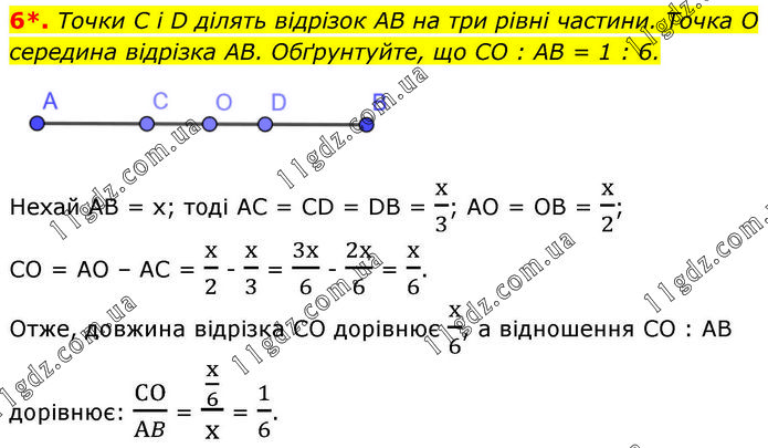 6*. Точки C i D ділять відрізок AB на три рівні частини. Точка O середина відрізка AB. Обґрунтуйте, що CO : AB = 1 : 6. Нехай АВ = х; тоді АС = CD = DB = x/3; AO = OB = x/2; CO = AO – AC = x/2 - x/3 = 3x/6 - 2x/6 = x/6. Отже, довжина відрізка CO дорівнює x/6, а відношення CO : AB дорівнює: CO/AB = (x/6)/x = 1/6.