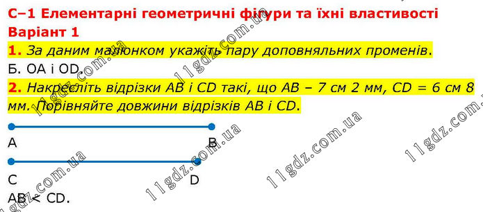 С–1 Елементарні геометричні фігури та їхні властивості Варіант 1 1. За даним малюнком укажіть пару доповняльних променів. Б. OA і OD. 2. Накресліть відрізки AB і CD такі, що AB – 7 см 2 мм, CD = 6 см 8 мм. Порівняйте довжини відрізків AB і CD. AB < CD.