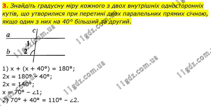 Знайдіть градусну міру кожного з двох внутрішніх односторонніх кутів, що утворилися при перетині двох паралельних прямих січною, якщо один з них на 40° більший за другий. 1) х + (х + 40°) = 180°; 2х = 180° – 40°; 2х = 140°; х = 70° – ∠1; 2) 70° + 40° = 110° – ∠2.