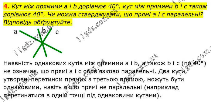Кут між прямими а і b дорівнює 40°, кут між прямими b і с також дорівнює 40°. Чи можна стверджувати, що прямі а і с паралельні? Відповідь обґрунтуйте. Наявність однакових кутів між прямими a і b, а також b і c (по 40°) не означає, що прямі a і c обов’язково паралельні. Два кути, утворені перетином прямих з третьою прямою, можуть бути однаковими, навіть якщо прямі не паралельні (наприклад перетинатися в одній точці під однаковими кутами).
