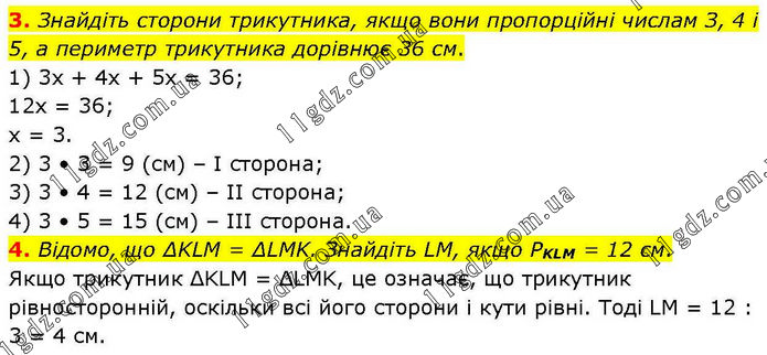 3. Знайдіть сторони трикутника, якщо вони пропорційні числам З, 4 і 5, а периметр трикутника дорівнює 36 см. 1) 3х + 4х + 5х = 36; 12х = 36; х = 3. 2) 3 • 3 = 9 (см) – І сторона; 3) 3 • 4 = 12 (см) – ІІ сторона; 4) 3 • 5 = 15 (см) – ІІІ сторона. 4. Відомо, що ΔKLM = ΔLMK. Знайдіть LM, якщо PKLM = 12 см. Якщо трикутник ΔKLM = ΔLMK, це означає, що трикутник рівносторонній, оскільки всі його сторони і кути рівні. Тоді LM = 12 : 3 = 4 см.