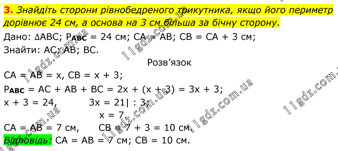 Знайдіть сторони рівнобедреного трикутника, якщо його периметр дорівнює 24 см, а основа на 3 см більша за бічну сторону. Дано: ∆АВС; РАВС = 24 см; СА = АВ; СВ = СА + 3 см; Знайти: АС; АВ; ВС. Розв’язок СА = АВ = х, СВ = х + 3; РАВС = АС + АВ + ВС = 2х + (х + 3) = 3х + 3; х + 3 = 24, 3х = 21| : 3; х = 7. СА = АВ = 7 см, СВ = 7 + 3 = 10 см. Відповідь: СА = АВ = 7 см; СВ = 10 см.