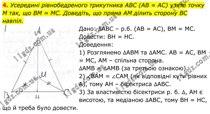 Усередині рівнобедреного трикутника АВС (АВ = АС) узято точку М так, що ВМ = МС. Доведіть, що пряма АМ ділить сторону ВС навпіл. Дано: ∆АВС – р.б. (АВ = АС), ВМ = МС. Довести: ВН = НС. Доведення: 1) Розглянемо ∆АВМ та ∆АМС. АВ = АС, ВМ = МС, АМ – спільна сторона. ∆АМВ = ∆АМВ (за третьою ознакою). 2) ∠ВАМ = ∠САМ (як відповідні кути рівних А), тому АН – бісектриса ∆АВС. 3) За властивістю бісектриси р. б. ∆, АН є висотою, та медіаною ∆АВС, тому ВН = НС, що й треба було довести.
