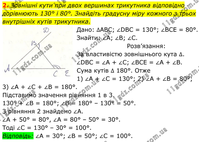 2. Зовнішні кути при двох вершинах трикутника відповідно дорівнюють 130° і 80°. Знайдіть градусну міру кожного з трьох внутрішніх кутів трикутника. Дано: ∆АВС; ∠DBC = 130°; ∠BCE = 80°. Знайти: ∠А; ∠В; ∠С. Розв’язання: За властивістю зовнішнього кута ∆. ∠DBC = ∠A + ∠C; ∠BCE = ∠A + ∠B. Сума кутів ∆ 180°. Отже 1) ∠А + ∠С = 130°; 2) ∠А + ∠В = 80°; 3) ∠А + ∠С + ∠В = 180°. Підставимо значення рівняння 1 в 3. 130° + ∠В = 180°; ∠В = 180° – 130° = 50°. З рівняння 2 знайдемо ∠А. ∠А + 50° = 80°, ∠А = 80° – 50° = 30°. Тоді ∠С = 130° – 30° = 100°. Відповідь: ∠А = 30°; ∠В = 50°; ∠С = 100°.