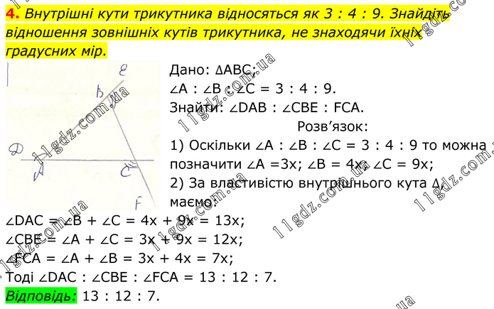 Внутрішні кути трикутника відносяться як 3 : 4 : 9. Знайдіть відношення зовнішніх кутів трикутника, не знаходячи їхніх градусних мір. Дано: ∆АВС; ∠А : ∠В : ∠С = 3 : 4 : 9. Знайти: ∠DAB : ∠CBE : FCA. Розв’язок: 1) Оскільки ∠А : ∠В : ∠С = 3 : 4 : 9 то можна позначити ∠А =3х; ∠В = 4х; ∠С = 9х; 2) За властивістю внутрішнього кута ∆, маємо: ∠DAC = ∠B + ∠C = 4x + 9x = 13x; ∠CBE = ∠A + ∠C = 3x + 9x = 12x; ∠FCA = ∠A + ∠B = 3x + 4x = 7x; Тоді ∠DAC : ∠CBE : ∠FCA = 13 : 12 : 7. Відповідь: 13 : 12 : 7.