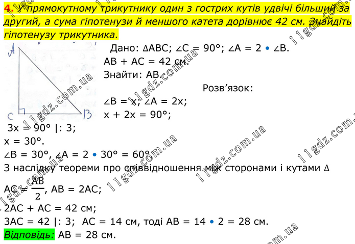 У прямокутному трикутнику один з гострих кутів удвічі більший за другий, а сума гіпотенузи й меншого катета дорівнює 42 см. Знайдіть гіпотенузу трикутника. Дано: ∆АВС; ∠С = 90°; ∠А = 2 • ∠В. АВ + АС = 42 см. Знайти: АВ. Розв’язок: ∠В = х; ∠А = 2х; х + 2х = 90°; 3х = 90° |: 3; х = 30°. ∠В = 30°, ∠А = 2 • 30° = 60°. З наслідку теореми про співвідношення між сторонами і кутами ∆ АС = АВ/2, АВ = 2АС; 2АС + АС = 42 см; 3АС = 42 |: 3; АС = 14 см, тоді АВ = 14 • 2 = 28 см. Відповідь: АВ = 28 см.