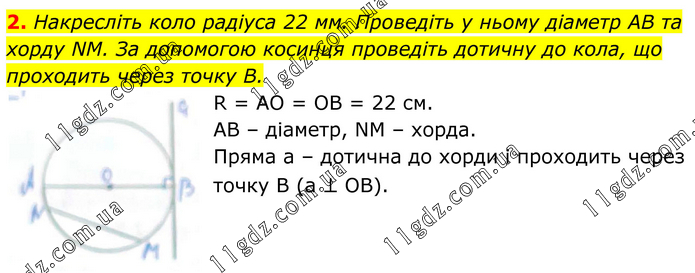 Накресліть коло радіуса 22 мм. Проведіть у ньому діаметр АВ та хорду NM. За допомогою косинця проведіть дотичну до кола, що проходить через точку В. R = AO = OB = 22 см. АВ – діаметр, NM – хорда. Пряма а – дотична до хорди і проходить через точку В (a ⊥ OB).