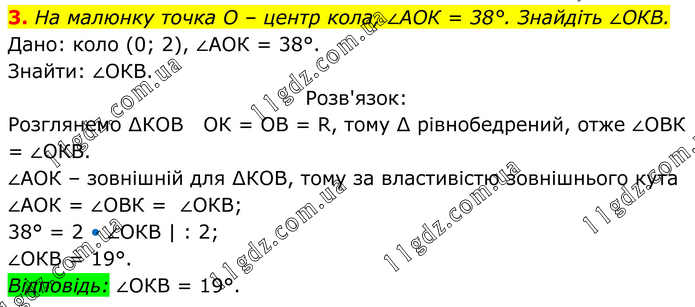 На малюнку точка О – центр кола, ∠АОК = 38°. Знайдіть ∠ОКВ. Дано: коло (0; 2), ∠АОК = 38°. Знайти: ∠ОКВ. Розв'язок: Розглянемо ∆КОВ ОК = ОВ = R, тому ∆ рівнобедрений, отже ∠ОВК = ∠ОКВ. ∠АОК – зовнішній для ∆КОВ, тому за властивістю зовнішнього кута ∠АОК = ∠ОВК = ∠ОКВ; 38° = 2 • ∠ОКВ | : 2; ∠ОКВ = 19°. Відповідь: ∠ОКВ = 19°.