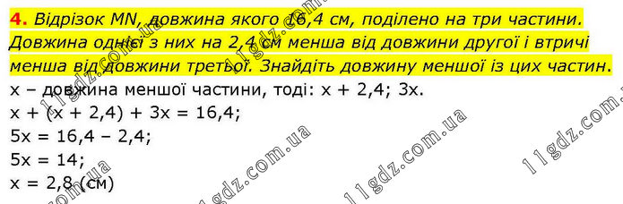 4. Відрізок MN, довжина якого 16,4 см, поділено на три частини. Довжина однієї з них на 2,4 см менша від довжини другої і втричі менша від довжини третьої. Знайдіть довжину меншої із цих частин. х – довжина меншої частини, тоді: х + 2,4; 3х. х + (х + 2,4) + 3х = 16,4; 5х = 16,4 – 2,4; 5х = 14; х = 2,8 (см)