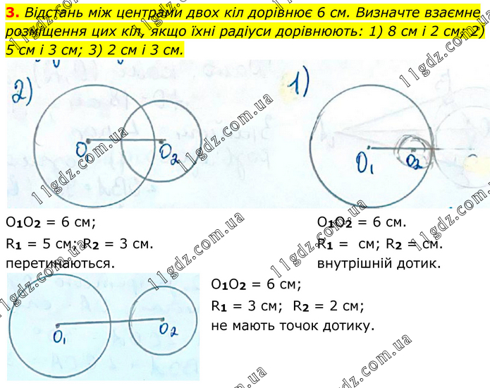 Відстань між центрами двох кіл дорівнює 6 см. Визначте взаємне розміщення цих кіл, якщо їхні радіуси дорівнюють: 1) 8 см і 2 см; 2) 5 см і 3 см; 3) 2 см і 3 см. О1О2 = 6 cм; R1 = 5 см; R2 = 3 см. перетинаються. О1О2 = 6 см. R1 = см; R2 = см. внутрішній дотик. О1О2 = 6 см; R1 = 3 см; R2 = 2 cм; не мають точок дотику.