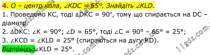 О – центр кола, ∠КDС = 65°. Знайдіть ∠КLD. 1. Проведемо КС, тоді ∠DKC = 90°, тому що спирається на DC – діаметр. 2. ∆DKC: ∠K = 90°; ∠D = 65°, тоді ∠С = 90° – 65° = 25°; 3. ∠KCD = ∠KLD = 25° (спираються на дугу KD). Відповідь:∠KLD = 25°.