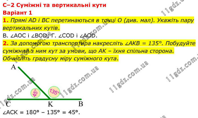 С–2 Суміжні та вертикальні кути Варіант 1 1. Прямі AD і BC перетинаються в точці O (див. мал). Укажіть пару вертикальних кутів. B. ∠AOC і ∠BOD; Г. ∠COD і ∠AOD. 2. За допомогою транспортира накресліть ∠AKB = 135°. Побудуйте суміжний з ним кут за умови, що AK – їхня спільна сторона. Обчисліть градусну міру суміжного кута. ∠АСК = 180° – 135° = 45°.