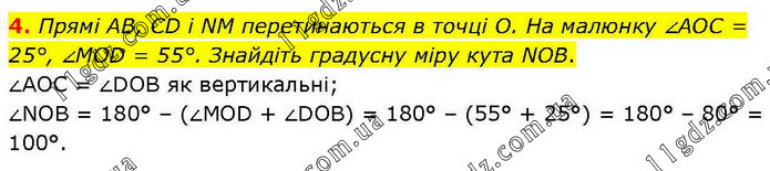 4. Прямі AB, CD і NM перетинаються в точці О. На малюнку ∠AOC = 25°, ∠MOD = 55°. Знайдіть градусну міру кута NOB. ∠АOC = ∠DOB як вертикальні; ∠NOB = 180° – (∠MOD + ∠DOB) = 180° – (55° + 25°) = 180° – 80° = 100°.