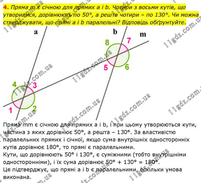 Пряма m є січною для прямих а і b. Чотири з восьми кутів, що утворилися, дорівнюють по 50°, а решта чотири – по 130°. Чи можна стверджувати, що прямі а і b паралельні? Відповідь обґрунтуйте. Пряма mm є січною для прямих a і b, і при цьому утворюються кути, частина з яких дорівнює 50°, а решта – 130°. За властивістю паралельних прямих і січної, якщо сума внутрішніх односторонніх кутів дорівнює 180°, то прямі є паралельними. Кути, що дорівнюють 50° і 130°, є суміжними (тобто внутрішніми односторонніми), і їх сума дорівнює 50° + 130° = 180°. Це підтверджує, що прямі a і b є паралельними, оскільки умова виконана.