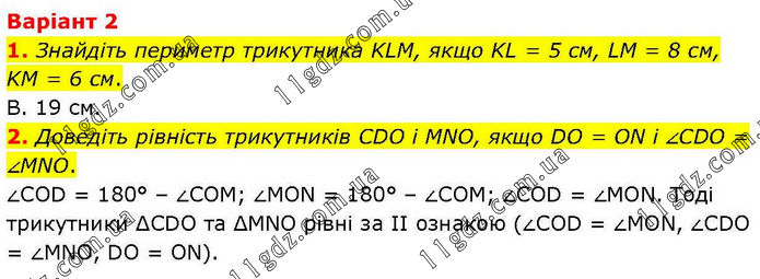 Варіант 2 1. Знайдіть периметр трикутника KLM, якщо KL = 5 см, LM = 8 см, KM = 6 см. В. 19 см. 2. Доведіть рівність трикутників CDO і MNO, якщо DO = ON і ∠CDO = ∠MNO. ∠COD = 180° – ∠COM; ∠MON = 180° – ∠COM; ∠COD = ∠MON. Тоді трикутники ΔCDO та ΔMNO рівні за ІІ ознакою (∠COD = ∠MON, ∠CDO = ∠MNO, DO = ON).