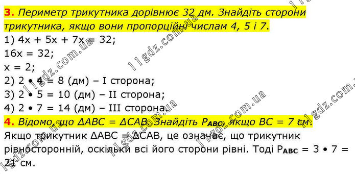 3. Периметр трикутника дорівнює 32 дм. Знайдіть сторони трикутника, якщо вони пропорційні числам 4, 5 і 7. 1) 4х + 5х + 7х = 32; 16х = 32; х = 2; 2) 2 • 4 = 8 (дм) – І сторона; 3) 2 • 5 = 10 (дм) – ІІ сторона; 4) 2 • 7 = 14 (дм) – ІІІ сторона. 4. Відомо, що ΔABC = ΔСАВ. Знайдіть PABC, якщо BC = 7 см. Якщо трикутник ΔABC = ΔCAB, це означає, що трикутник рівносторонній, оскільки всі його сторони рівні. Тоді РАВС = 3 • 7 = 21 см.
