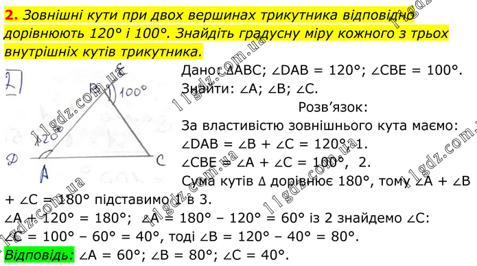 2. Зовнішні кути при двох вершинах трикутника відповідно дорівнюють 120° і 100°. Знайдіть градусну міру кожного з трьох внутрішніх кутів трикутника. Дано: ∆АВС; ∠DAB = 120°; ∠CBE = 100°. Знайти: ∠А; ∠В; ∠С. Розв’язок: За властивістю зовнішнього кута маємо: ∠DAB = ∠B + ∠C = 120°, 1. ∠CBE = ∠A + ∠C = 100°, 2. Cума кутів ∆ дорівнює 180°, тому ∠А + ∠В + ∠С = 180° підставимо 1 в 3. ∠А + 120° = 180°; ∠А = 180° – 120° = 60° із 2 знайдемо ∠С: ∠С = 100° – 60° = 40°, тоді ∠В = 120° – 40° = 80°. Відповідь: ∠А = 60°; ∠В = 80°; ∠С = 40°.