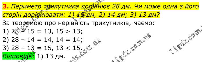 Периметр трикутника дорівнює 28 дм. Чи може одна з його сторін дорівнювати: 1) 15 дм, 2) 14 дм; 3) 13 дм? За теоремою про нерівність трикутників, маємо: 1) 28 – 15 = 13, 15 > 13; 2) 28 – 14 = 14, 14 = 14; 3) 28 – 13 = 15, 13 < 15. Відповідь: 1) 13 дм.