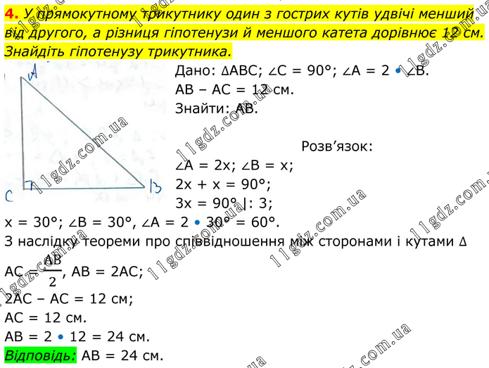 У прямокутному трикутнику один з гострих кутів удвічі менший від другого, а різниця гіпотенузи й меншого катета дорівнює 12 см. Знайдіть гіпотенузу трикутника. Дано: ∆АВС; ∠С = 90°; ∠А = 2 • ∠В. АВ – АС = 12 см. Знайти: АВ. Розв’язок: ∠А = 2х; ∠В = х; 2х + х = 90°; 3х = 90° |: 3; х = 30°; ∠В = 30°, ∠А = 2 • 30° = 60°. З наслідку теореми про співвідношення між сторонами і кутами ∆ АС = АВ/2, АВ = 2АС; 2АС – АС = 12 см; АС = 12 см. АВ = 2 • 12 = 24 см. Відповідь: АВ = 24 см.