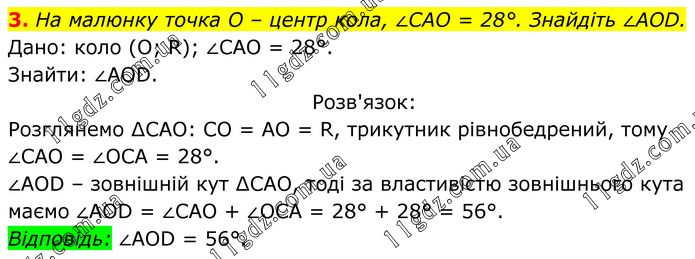 На малюнку точка О – центр кола, ∠САО = 28°. Знайдіть ∠АОD. Дано: коло (О; R); ∠CAO = 28°. Знайти: ∠AOD. Розв'язок: Розглянемо ∆САО: СО = АО = R, трикутник рівнобедрений, тому ∠САО = ∠ОСА = 28°. ∠AOD – зовнішній кут ∆САО, тоді за властивістю зовнішнього кута маємо ∠AOD = ∠CAO + ∠OCA = 28° + 28° = 56°. Відповідь: ∠AOD = 56°.