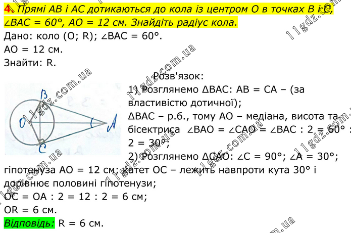 Прямі АВ і АС дотикаються до кола із центром O в точках B і С, ∠ВАС = 60°, АО = 12 см. Знайдіть радіус кола. Дано: коло (О; R); ∠BAC = 60°. AO = 12 см. Знайти: R. Розв'язок: 1) Розглянемо ∆ВАС: АВ = СА – (за властивістю дотичної); ∆ВАС – р.б., тому АО – медіана, висота та бісектриса ∠ВАО = ∠САО = ∠ВАС : 2 = 60° : 2 = 30°; 2) Розглянемо ∆САО: ∠С = 90°; ∠А = 30°; гіпотенуза АО = 12 см; катет ОС – лежить навпроти кута 30° і дорівнює половині гіпотенузи; ОС = ОА : 2 = 12 : 2 = 6 см; OR = 6 см. Відповідь: R = 6 см.