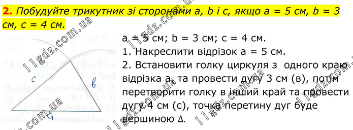 Побудуйте трикутник зі сторонами а, b і с, якщо а = 5 см, b = 3 см, с = 4 см. a = 5 см; b = 3 cм; с = 4 см. 1. Накреслити відрізок а = 5 см. 2. Встановити голку циркуля з одного краю відрізка а, та провести дугу 3 см (в), потім перетворити голку в інший край та провести дугу 4 см (с), точка перетину дуг буде вершиною ∆.