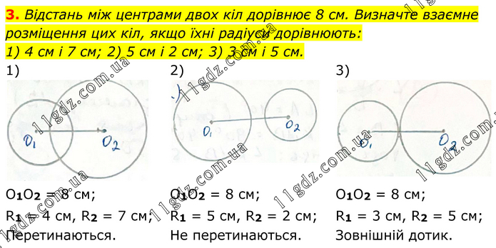 Відстань між центрами двох кіл дорівнює 8 см. Визначте взаємне розміщення цих кіл, якщо їхні радіуси дорівнюють: 1) 4 см і 7 см; 2) 5 см і 2 см; 3) 3 см і 5 см. 1) 2) 3) О1О2 = 8 cм; R1 = 4 см, R2 = 7 см; Перетинаються. О1О2 = 8 cм; R1 = 5 см, R2 = 2 см; Не перетинаються. О1О2 = 8 cм; R1 = 3 см, R2 = 5 см; Зовнішній дотик.
