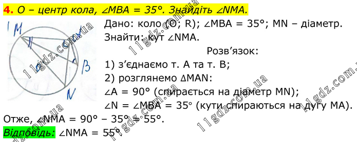 О – центр кола, ∠МВА = 35°. Знайдіть ∠NМА. Дано: коло (О; R); ∠MBA = 35°; MN – діаметр. Знайти: кут ∠NMA. Розв’язок: 1) з’єднаємо т. А та т. В; 2) розглянемо ∆MAN: ∠A = 90° (спирається на діаметр MN); ∠N = ∠MBA = 35° (кути спираються на дугу МА). Отже, ∠NMA = 90° – 35° = 55°. Відповідь: ∠NMA = 55°.