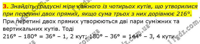3. Знайдіть градусні міри кожного із чотирьох кутів, що утворилися при перетині двох прямих, якщо сума трьох з них дорівнює 216°. При перетині двох прямих утворюються дві пари суміжних та вертикальних кутів. Тоді 216° – 180° = 36° – 1, 2 кут; 180° – 36° = 144° – 3, 4 кути.