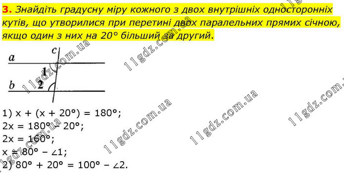 3. Знайдіть градусну міру кожного з двох внутрішніх односторонніх кутів, що утворилися при перетині двох паралельних прямих січною, якщо один з них на 20° більший за другий. 1) х + (х + 20°) = 180°; 2х = 180° – 20°; 2х = 160°; х = 80° – ∠1; 2) 80° + 20° = 100° – ∠2.