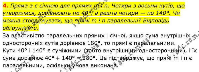 4. Пряма а є січною для прямих m і n. Чотири з восьми кутів, що утворилися, дорівнюють по 40°, а решта чотири — по 140°. Чи можна стверджувати, що прямі m і n паралельні? Відповідь обґрунтуйте. За властивістю паралельних прямих і січної, якщо сума внутрішніх односторонніх кутів дорівнює 180°, то прямі є паралельними. Кути 40° і 140° є суміжними (тобто внутрішніми односторонніми), і їх сума дорівнює 40° + 140° = 180°. Це підтверджує, що прямі m і n є паралельними, оскільки умова виконана.