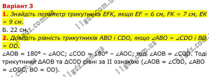 Варіант 3 1. Знайдіть периметр трикутника EFK, якщо EF = 6 см, FK = 7 см, EK = 9 см. Б. 22 см. 2. Доведіть рівність трикутників ABO і CDO, якщо ∠ABO = ∠CDO і BO = OD. ∠АОВ = 180° – ∠АОС; ∠COD = 180° – ∠AOC; тоді ∠AOB = ∠COD. Тоді трикутники ΔAOB та ΔCOD рівні за ІІ ознакою (∠AOB = ∠COD, ∠ABO = ∠ODC, BO = OD).