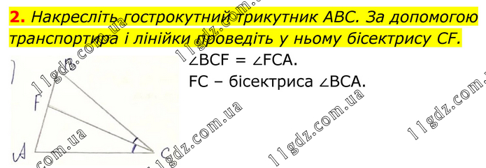 Накресліть гострокутний трикутник АВС. За допомогою транспортира і лінійки проведіть у ньому бісектрису СF. ∠BCF = ∠FCA. FC – бісектриса ∠ВСА.
