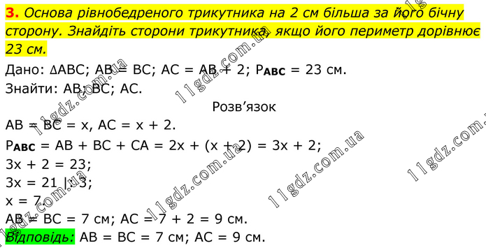 Основа рівнобедреного трикутника на 2 см більша за його бічну сторону. Знайдіть сторони трикутника, якщо його периметр дорівнює 23 см. Дано: ∆АВС; АВ = ВС; АС = АВ + 2; РАВС = 23 см. Знайти: АВ; ВС; АС. Розв’язок АВ = ВС = х, АС = х + 2. РАВС = АВ + ВС + СА = 2х + (х + 2) = 3х + 2; 3х + 2 = 23; 3х = 21 |: 3; x = 7. AB = BC = 7 см; АС = 7 + 2 = 9 см. Відповідь: АВ = ВС = 7 см; АС = 9 см.