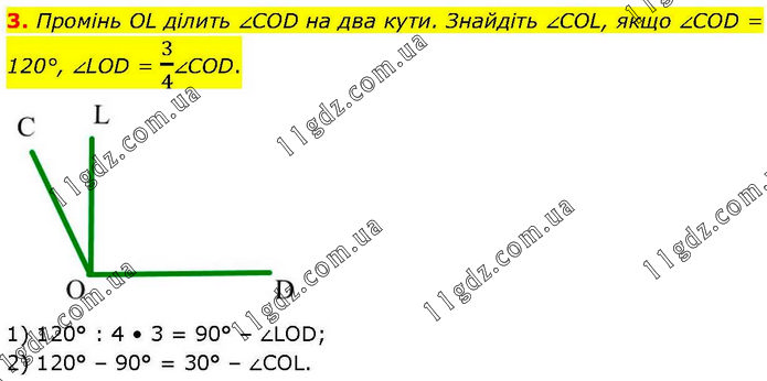 3. Промінь OL ділить ∠COD на два кути. Знайдіть ∠COL, якщо ∠COD = 120°, ∠LOD = 3/4∠COD. 1) 120° : 4 • 3 = 90° – ∠LOD; 2) 120° – 90° = 30° – ∠COL.