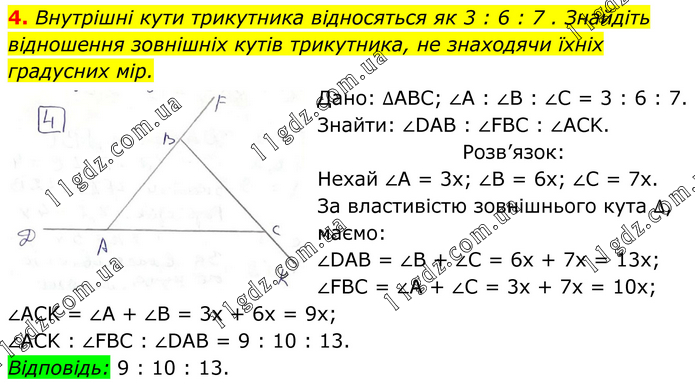 Внутрішні кути трикутника відносяться як 3 : 6 : 7 . Знайдіть відношення зовнішніх кутів трикутника, не знаходячи їхніх градусних мір. Дано: ∆АВС; ∠А : ∠В : ∠С = 3 : 6 : 7. Знайти: ∠DAB : ∠FBC : ∠ACK. Розв’язок: Нехай ∠А = 3х; ∠В = 6х; ∠С = 7х. За властивістю зовнішнього кута ∆, маємо: ∠DAB = ∠B + ∠C = 6x + 7x = 13x; ∠FBC = ∠A + ∠C = 3x + 7x = 10x; ∠ACK = ∠A + ∠B = 3x + 6x = 9x; ∠ACK : ∠FBC : ∠DAB = 9 : 10 : 13. Відповідь: 9 : 10 : 13.