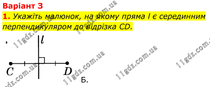 Варіант З 1. Укажіть малюнок, на якому пряма l є серединним перпендикуляром до відрізка СD. Б.