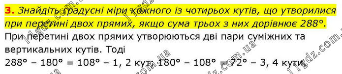 3. Знайдіть градусні міри кожного із чотирьох кутів, що утворилися при перетині двох прямих, якщо сума трьох з них дорівнює 288°. При перетині двох прямих утворюються дві пари суміжних та вертикальних кутів. Тоді 288° – 180° = 108° – 1, 2 кут; 180° – 108° = 72° – 3, 4 кути.