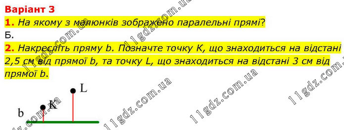 Варіант 3 1. На якому з малюнків зображено паралельні прямі? Б. 2. Накресліть пряму b. Позначте точку К, що знаходиться на відстані 2,5 см від прямої b, та точку L, що знаходиться на відстані 3 см від прямої b.