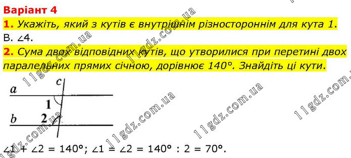 Варіант 4 1. Укажіть, який з кутів є внутрішнім різностороннім для кута 1. B. ∠4. 2. Сума двох відповідних кутів, що утворилися при перетині двох паралельних прямих січною, дорівнює 140°. Знайдіть ці кути. ∠1 + ∠2 = 140°; ∠1 = ∠2 = 140° : 2 = 70°.