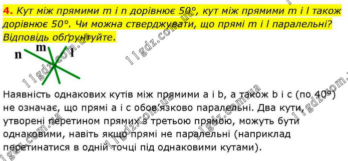 4. Кут між прямими m і n дорівнює 50°, кут між прямими m і l також дорівнює 50°. Чи можна стверджувати, що прямі m і l паралельні? Відповідь обґрунтуйте. Наявність однакових кутів між прямими a і b, а також b і c (по 40°) не означає, що прямі a і c обов’язково паралельні. Два кути, утворені перетином прямих з третьою прямою, можуть бути однаковими, навіть якщо прямі не паралельні (наприклад перетинатися в одній точці під однаковими кутами).
