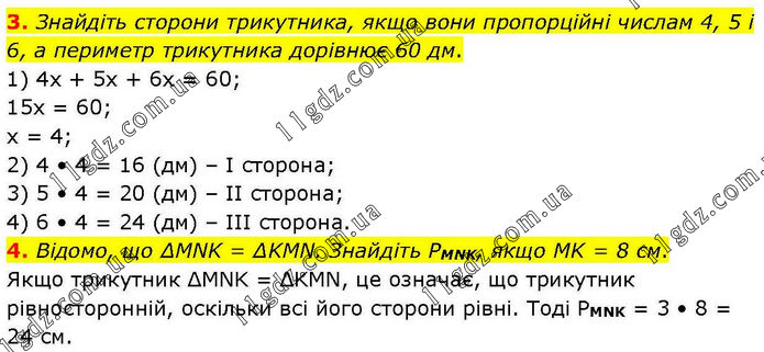 3. Знайдіть сторони трикутника, якщо вони пропорційні числам 4, 5 і 6, а периметр трикутника дорівнює 60 дм. 1) 4х + 5х + 6х = 60; 15х = 60; х = 4; 2) 4 • 4 = 16 (дм) – І сторона; 3) 5 • 4 = 20 (дм) – ІІ сторона; 4) 6 • 4 = 24 (дм) – ІІІ сторона. 4. Відомо, що ΔMNK = ΔKMN. Знайдіть PMNK, якщо MK = 8 см. Якщо трикутник ΔMNK = ΔKMN, це означає, що трикутник рівносторонній, оскільки всі його сторони рівні. Тоді РMNK = 3 • 8 = 24 см.