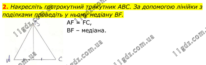 Накресліть гострокутний трикутник АВС. За допомогою лінійки з поділками проведіть у ньому медіану ВF. AF = FC, BF – медіана.