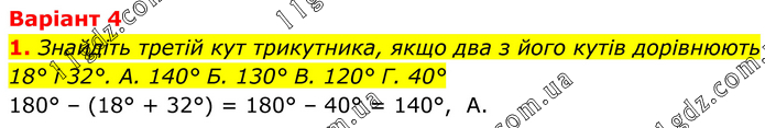 Варіант 4 1. Знайдіть третій кут трикутника, якщо два з його кутів дорівнюють 18° і 32°. А. 140° Б. 130° В. 120° Г. 40° 180° – (18° + 32°) = 180° – 40° = 140°, A.