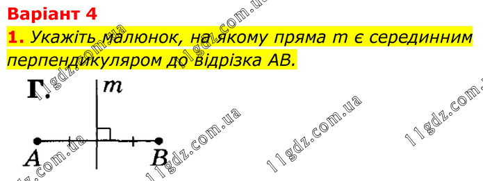 Варіант 4 1. Укажіть малюнок, на якому пряма m є серединним перпендикуляром до відрізка АВ.