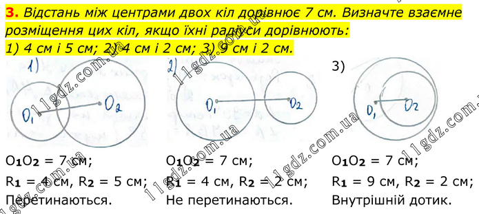 Відстань між центрами двох кіл дорівнює 7 см. Визначте взаємне розміщення цих кіл, якщо їхні радіуси дорівнюють: 1) 4 см і 5 см; 2) 4 см і 2 см; 3) 9 см і 2 см. 3) О1О2 = 7 см; R1 = 4 см, R2 = 5 см; Перетинаються. О1О2 = 7 см; R1 = 4 см, R2 = 2 см; Не перетинаються. О1О2 = 7 см; R1 = 9 см, R2 = 2 см; Внутрішній дотик.
