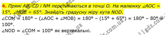 4. Прямі AB, CD і NM перетинаються в точці О. На малюнку ∠AOC = 15°, ∠MOB = 65°. Знайдіть градусну міру кута NOD. ∠СОМ = 180° – (∠АОС + ∠МОВ) = 180° – (15° + 65°) = 180° – 80° = 100°. ∠NOD = ∠СОM = 100° як вертикальні.
